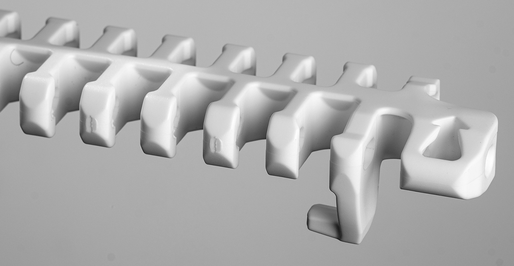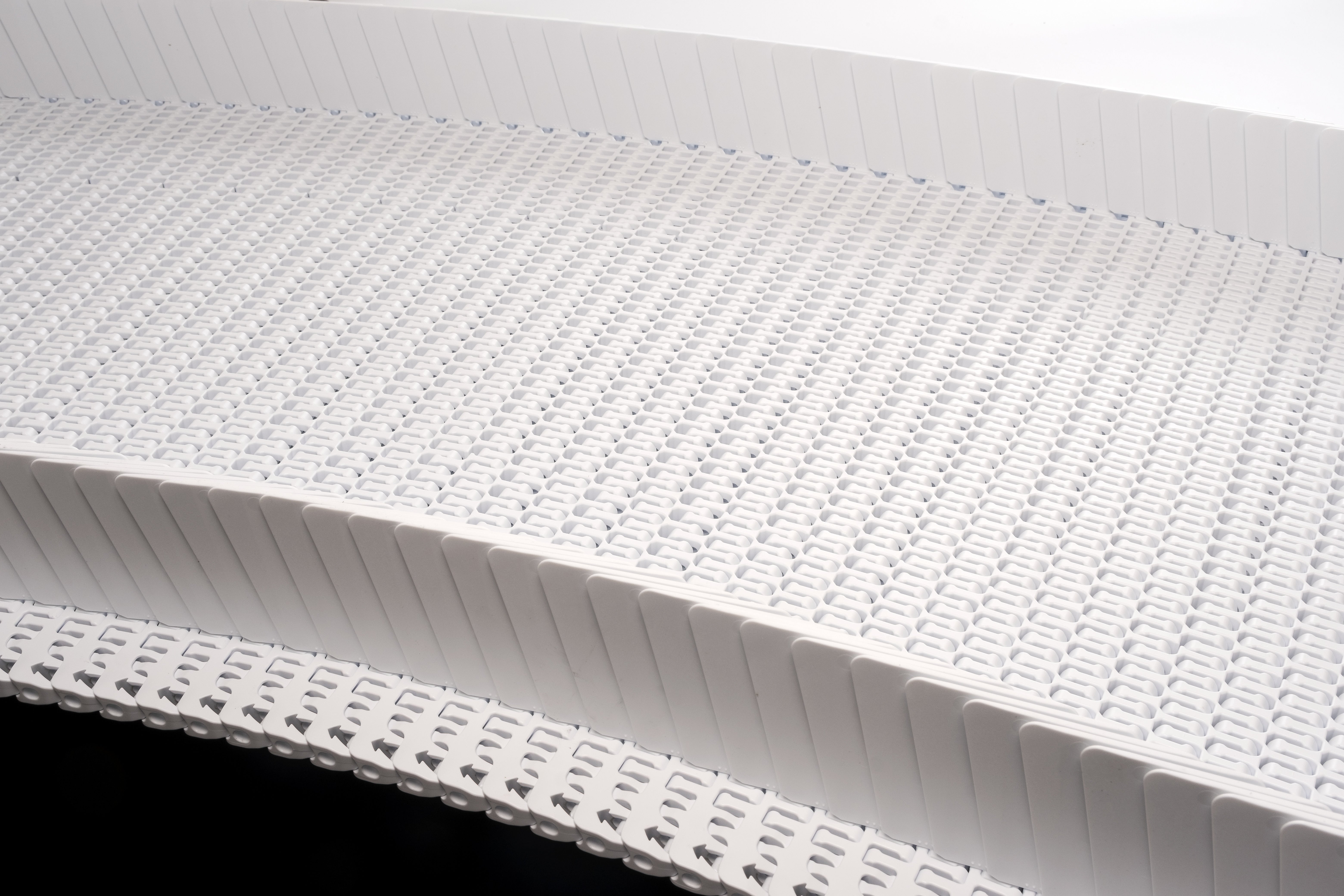 - Designed for radius applications with a turn radius of 2.2 times the belt width (measured from inside edge).
