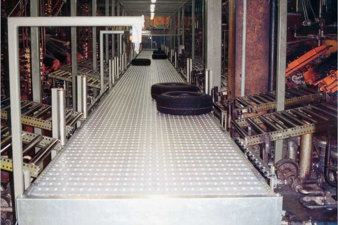 Reifenhersteller in aller Welt sparen Geld mit ihren Trenchlinien durch Umrüsten auf ein Intralox-System. Mit der Transverse Roller Top-Lösung (TRT) von Intralox können Reifenwerke die Übergabezeit des Produkts vom Kühlband nach der Presse zur Trenchlinie vorhersagen. Eine solche Vorhersage ist bei Verwendung von Flachgurten aufgrund der Reibung zwischen den Reifen und dem Gummiband (die zu häufigen Reifenstaus führt) nicht möglich.