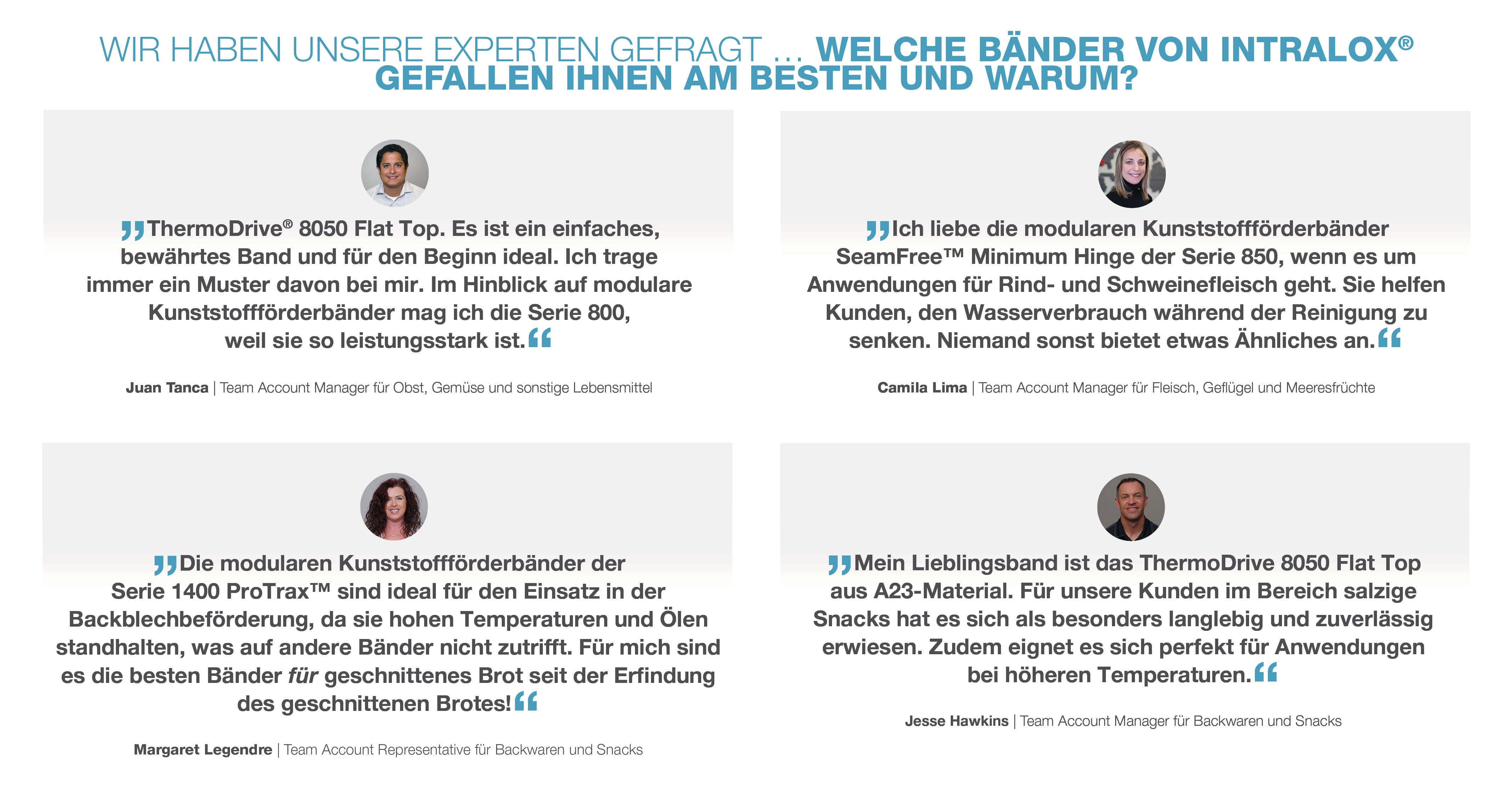 Tipp von dem Intralox-Team: Da Lebensmittelprodukte und -anwendungen so stark variieren, sollten Sie sich am besten an die Experten von Intralox wenden, um Hilfe bei der Auswahl des richtigen modularen Kunststoffförderbandes oder ThermoDrive-Förderbandes zu erhalten.