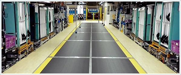 Un fabricante de automóviles deseaba mejorar las condiciones ergonómicas de los trabajadores en la cadena de montaje de puertas de su planta en el Reino Unido. El proceso de montaje de puertas requería una gran cantidad de estiramientos, desplazamientos e inclinaciones en sus 34 estaciones de trabajo, cada una de las cuales mide aproximadamente 14 pies x 4 pies (4,2 m x 1,2 m). Aunque los responsables de la planta estaban interesados en añadir transportadores de personas en las estaciones de trabajo, tenían unos requisitos estrictos. La solución no tendría que requerir mantenimiento, ya que no se asignaría personal de apoyo adicional en la zona. Debido a la ubicación de los niveles de entresuelo de la línea se descartó la excavación de fosos para colocar los transportadores. El fabricante de automóviles también necesitaba que el material de la banda fuera conductor y que el tiempo de takt estándar para el área (62 segundos) permaneciera igual.