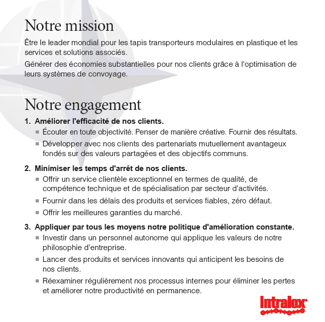 Intralox s'efforce de rester un partenaire de convoyage sur le long terme pour ses clients. La mission d'Intralox repose sur cet engagement.