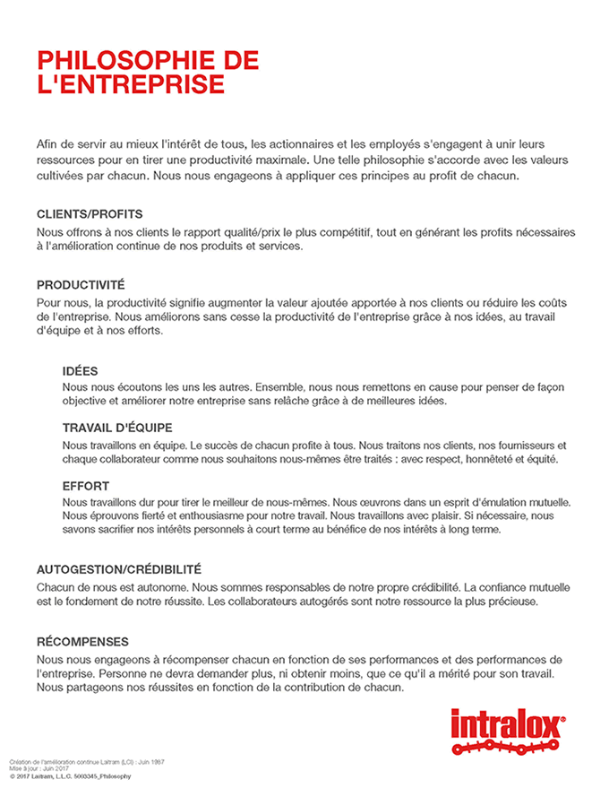 Depuis plus de 50 ans, Intralox est réputé pour ses pratiques commerciales éthiques et responsables. Cette réputation nous est chère et nous nous efforçons de faire perdurer les principes établis par notre fondateur J.-M. Lapeyre. Il était convaincu que la réussite d'une entreprise passait nécessairement par un travail de qualité au quotidien et par l'engagement consistant à traiter les clients, les employés et les fournisseurs avec honnêteté, équité et respect. Ces principes forment le socle de la philosophie d'entreprise d'Intralox. Nous nous efforçons de les mettre en pratique au quotidien, dans l'intérêt de nos clients.