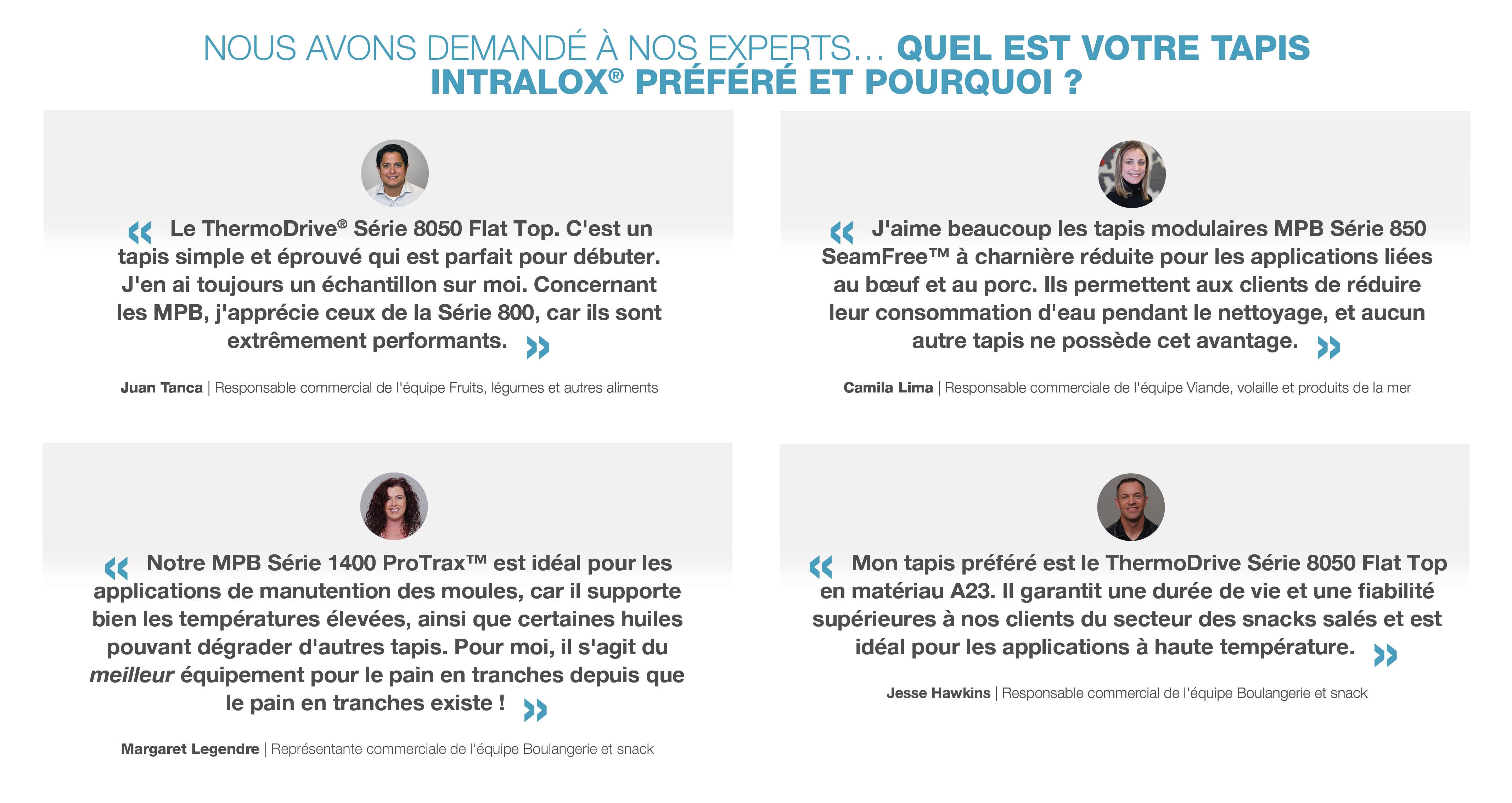 Où le tapis sera-t-il utilisé ? Quelles sont les conditions environnementales de fonctionnement de la ligne, comme la température et l'exposition à l'humidité ? Le produit alimentaire sera-t-il en contact direct avec le tapis ? Ce sont quelques-uns des facteurs à prendre en compte avant de pouvoir recommander des tapis MPB ou des tapis ThermoDrive. Chez Intralox, nous mettons en relation nos clients avec nos experts de l'industrie afin de les aider à choisir le type de tapis le plus adapté à leurs besoins.