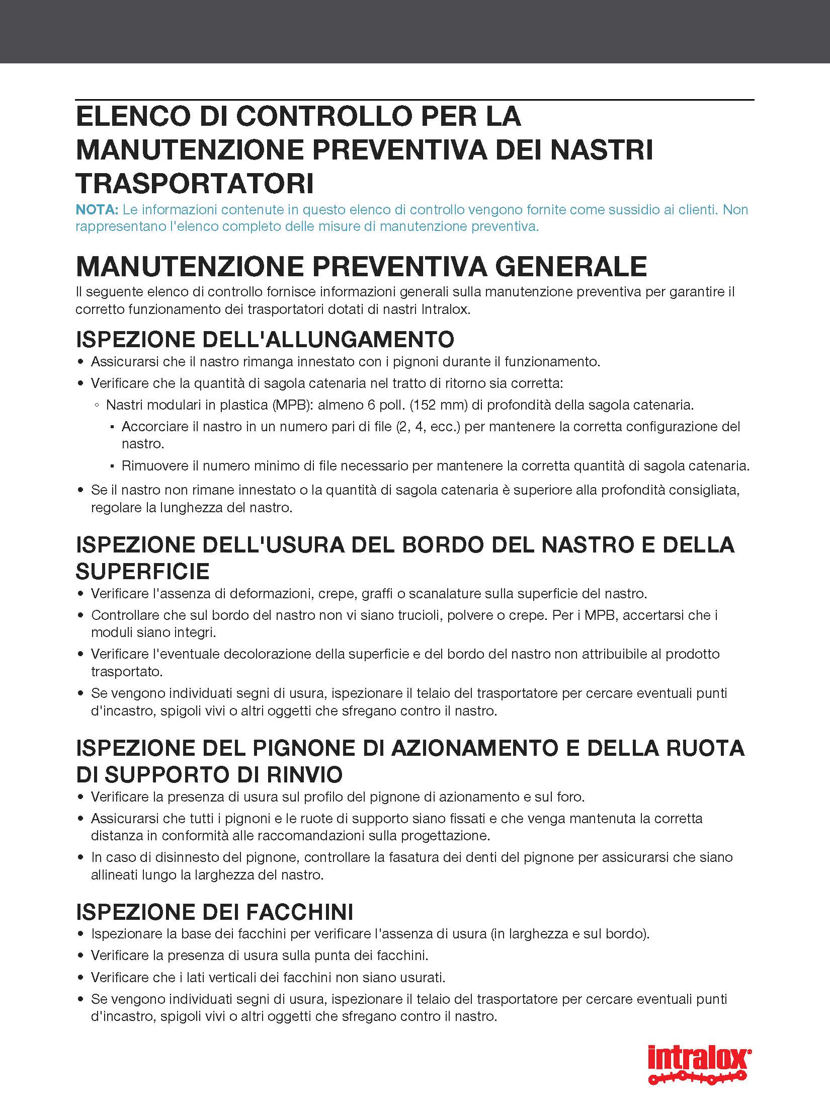 Per ulteriori informazioni sulle opzioni di assistenza Intralox disponibili in caso di domande sulla manutenzione preventiva, visitate la pagina dell'assistenza clienti.