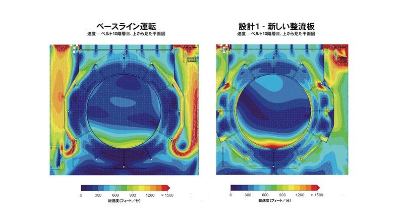 全体的な気流量の改善、左右のエア浪費の減少、送風機から遠い部分にできる無気流ゾーンの減少(画像の下端部)が示されている