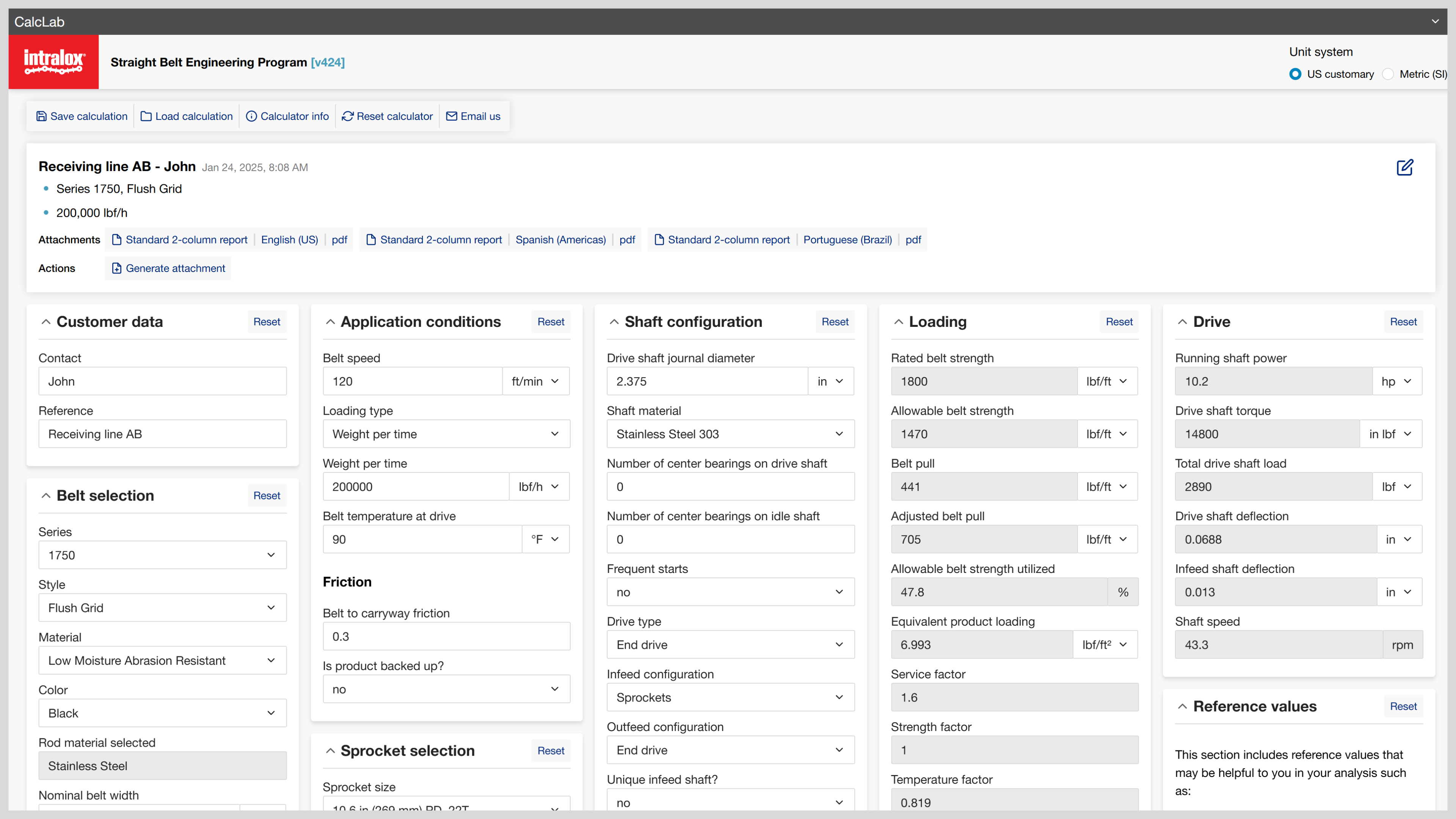 CalcLab now looks more like the Intralox website, complete with a simpler interface and better readability. It’s also more compatible with mobile devices so you can evaluate your applications or products at any time. - Reports Attached to Saved Calculations