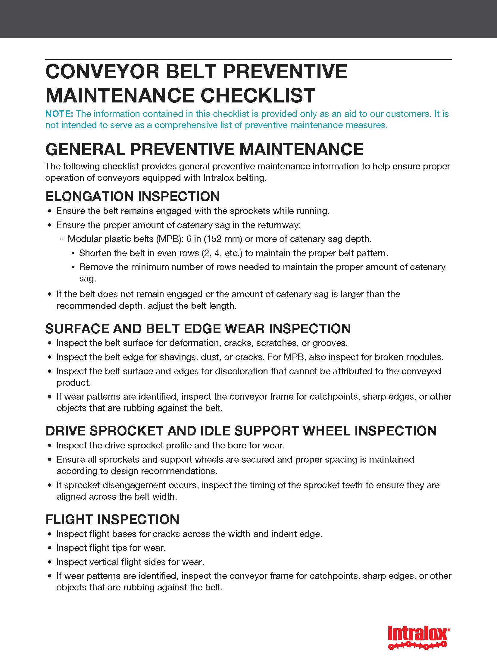 To maximize efficiency, always have a checklist for any preventive maintenance due to be performed on the belts. Strive to create lists for tasks that should be completed regularly; for instance, daily, weekly, monthly, quarterly, and yearly.