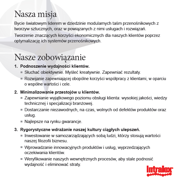 Firma Intralox dokłada wszelkich starań, aby być najlepszym długoterminowym partnerem w dziedzinie rozwiązań przenośnikowych. Deklaracja misji firmy Intralox wymienia to zobowiązanie.