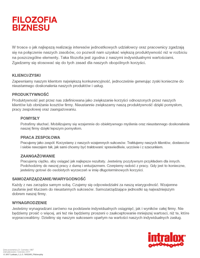 Od ponad 50 lat firma Intralox jest znana z etycznych i odpowiedzialnych praktyk biznesowych. Cenimy sobie tę reputację i dlatego zależy nam na szerzeniu zasad, które wprowadził założyciel naszej firmy, J.M. Lapeyre. J.M. wierzył, że podstawą istnienia wielkich firm jest rzetelne wywiązywanie się na co dzień ze swoich obowiązków oraz traktowanie klientów, pracowników i dostawców uczciwie, rzetelnie i z szacunkiem. Te zasady znajdują odzwierciedlenie w filozofii działalności firmy Intralox. Naszym celem jest stosowanie tych zasad dla dobra naszych klientów.