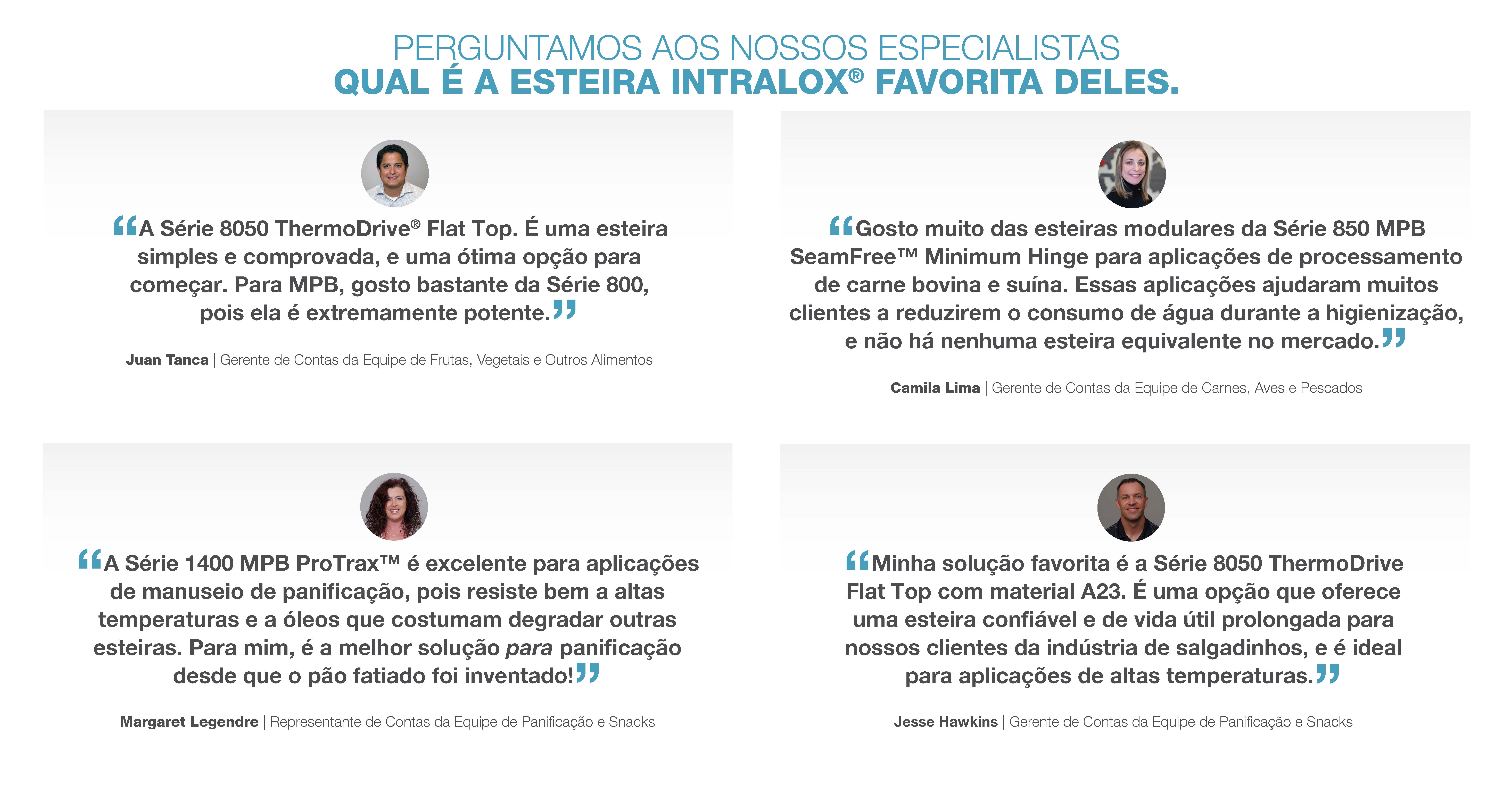 Onde a esteira será usada? Quais são as condições de funcionamento ambientais da linha, como a temperatura e a exposição à umidade? O produto alimentício entrará em contato direto com a esteira? Esses são apenas alguns dos fatores que devem ser considerados antes que a esteira MPB ou ThermoDrive possa ser recomendada. Na Intralox, nós conectamos os clientes aos nossos especialistas da indústria para ajudar a determinar qual seria a melhor esteira para cada situação.